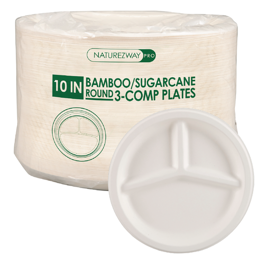Eco-Friendly 125 PACK 10” Inch Bamboo Round 3 Comp. Plates – Compostable & Sustainable