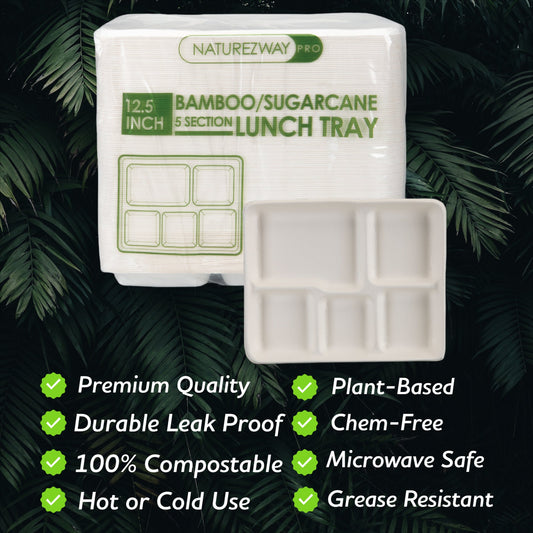 Eco-Friendly 125 PACK 10.5"x 8.5” Inch Bamboo 5 Compartment Lunch Trays – Compostable & Sustainable